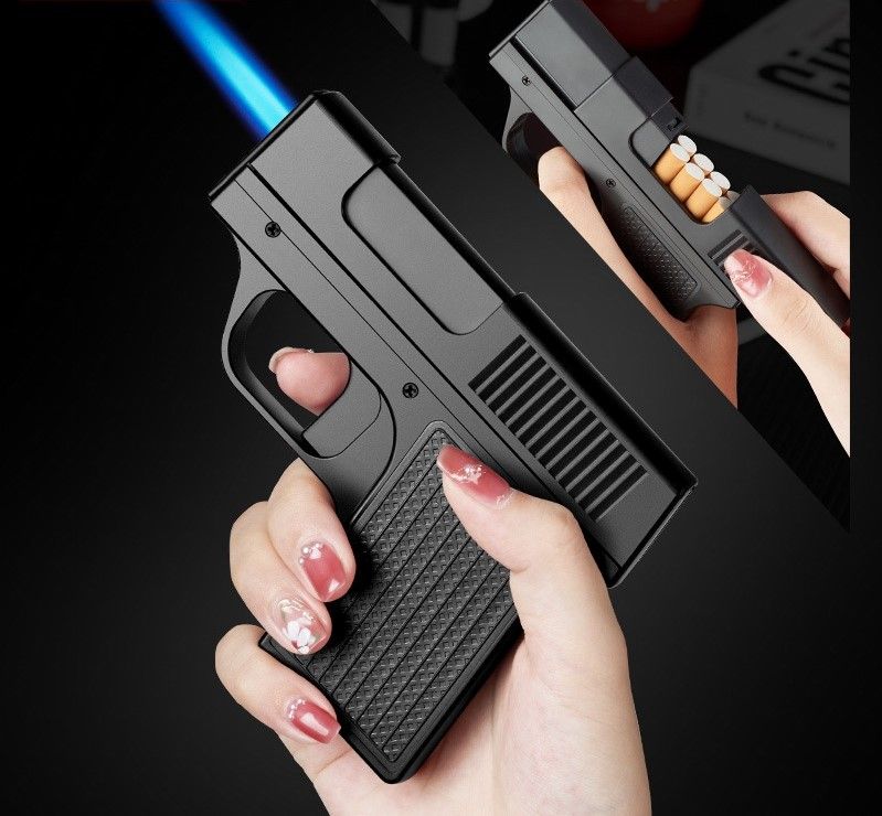 Pistoleto formos cigarečių dėklas - porcigaras su žiebtuvėliu. Porcigaras talpina 10 cigarečių, o jame esantis žiebtuvėlis yra neužpučiamas vėjo ir padeda greitai bei lengvai prisidegti cigaretę.