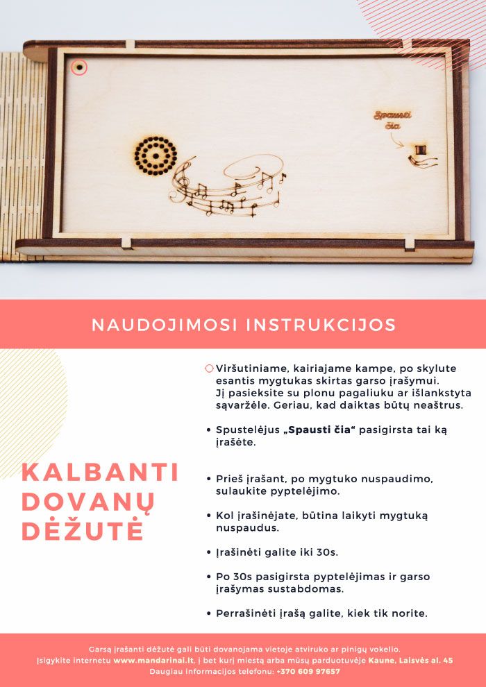 Originali medinė rankų darbo dėžutė kuri įrašys Jūsų balsu tariamą sveikinimą, palinkėjimą ar šmaikštų juokelį. Dėžutę galėsite padovanoti vietoje atviruko ar pinigų vokelio. Pasveikinkite Jūsų artimą žmogų originaliai! Garso įrašymo funkcija dėžutę paverčia dar nuoširdesne, įsivaizduokite, kaip smagu išgirsti Jūsų balsu įrašytą sveikinimą, o galbūt netgi dainą!