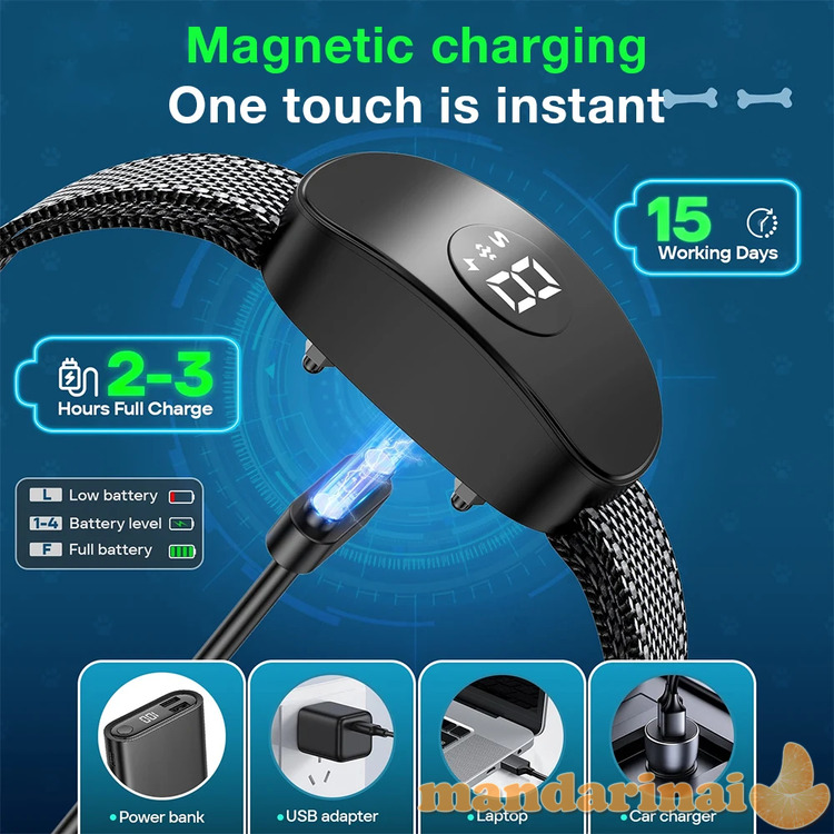 Šis anti-lojimo antkaklis yra pakraunamas ir neperšlampamas: antkaklyje yra įmontuota USB įkraunama baterija. Ji visiškai įkraunama maždaug per 2–3 valandas ir iki kito krovimo išlaiko apie 10–15 dienų. IP67 vandeniui atsparaus lygio dizainas leidžia Jūsų šuniukui žaisti lauke bet kokiomis oro sąlygomis (atkreipkite dėmesį, kad panardinimui po vandeniu antkaklis nėra atsparus, tad kai šuo eina maudytis, antkaklį reikia nuimti).