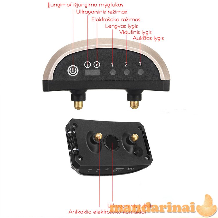 - Ant antkaklio esantis „įjungimo/išjungimo“ mygtukas skirtas įjungti antkaklį bei pasirinkti norimą ultragarso ar elektrošoko režimą bei jo intensyvumo lygį nuo 1 iki 3.