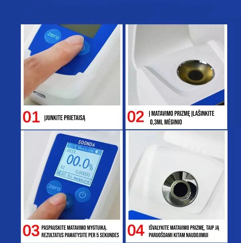 - Tikslumas: ±0,2%Brix / ±1 ℃