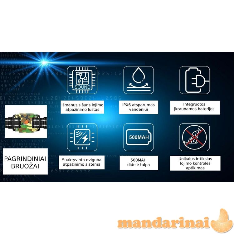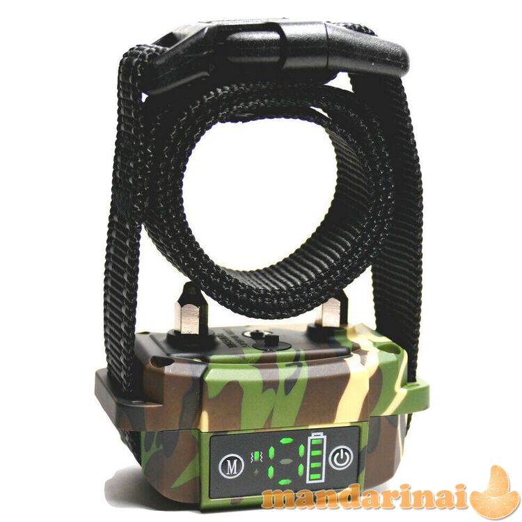 Stilingas su kamufliažinio rašto dizainu ir visiškai vandeniui atsparus antkaklis nuo lojimo. Mažas ir lengvas, tinkantis didelių veislių šunims. Antkaklis yra su reguliuojamu sagties dirželiu. Intelektuali dviguba lojimo atpažinimo sistema su dviem darbo režimais: fiksuota arba ciklinė. Taip pat antkaklis turi 6 jautrumo lygius: galite pasirinkti ir reguliuoti vibraciją / elektros šoką. Antkaklis taip pat pasižymi dvigubais treniruočių režimais: kai antkaklis įjungtas, įrenginys siunčia aukšto tono garsą, tada perduoda vibraciją ir / arba elektros šoką. Galite išjungti šoko funkciją, jei jos nereikia.